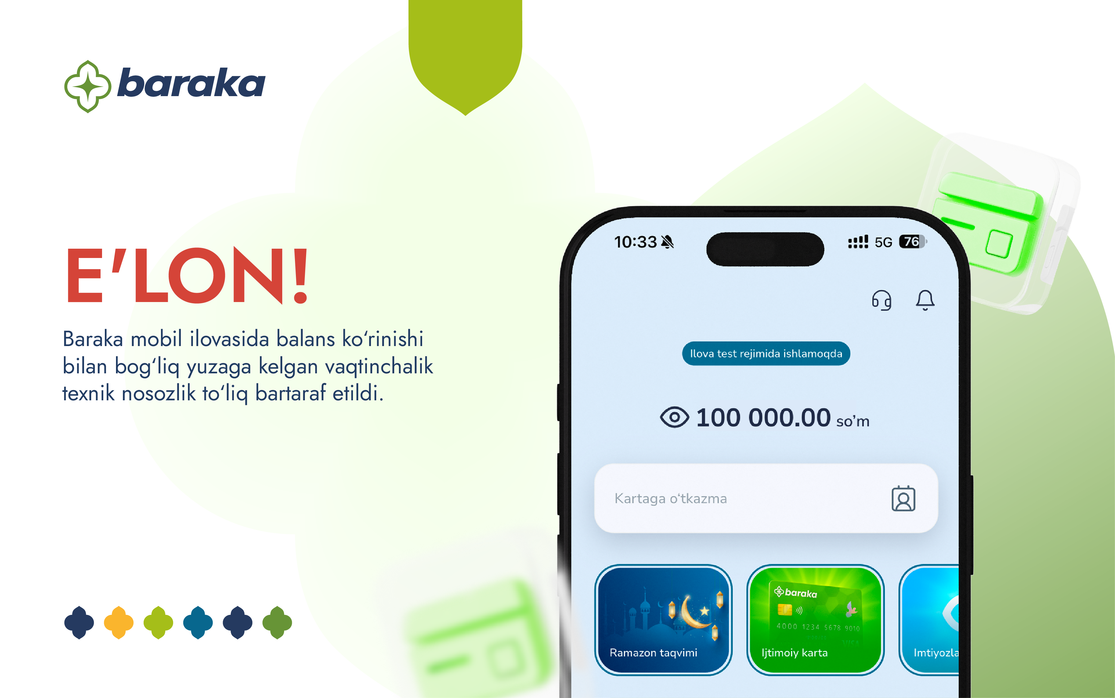 E’lon Hurmatli foydalanuvchilar, Baraka mobil ilovasida balans ko‘rinishi bilan bog‘liq yuzaga kelgan vaqtinchalik texnik nosozlik to‘liq bartaraf etildi. Hozirda...