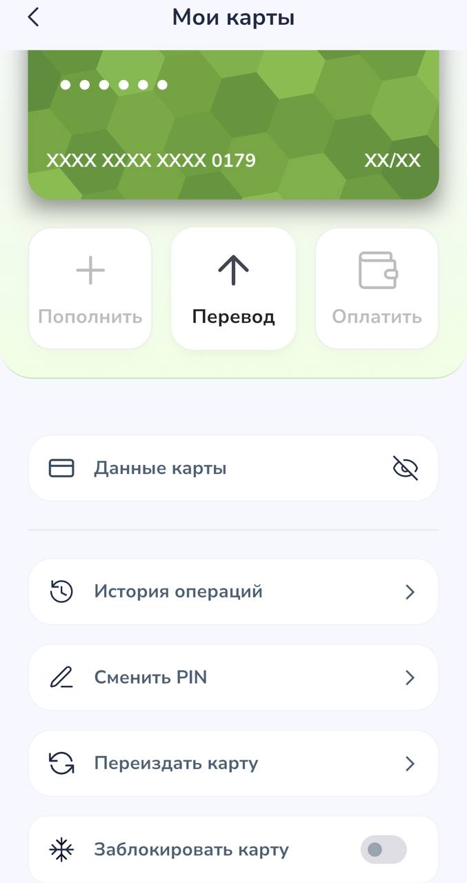 Для перевыпуска карты необходимо перейти на «Главную страницу» приложения.